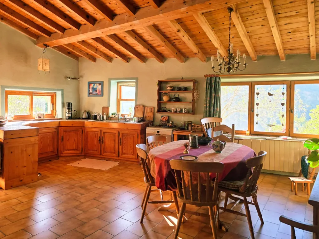 Une vaste cuisine pour des temps de partages autours des repas, au coin du poêle, devant la fenêtre aux oiseaux…